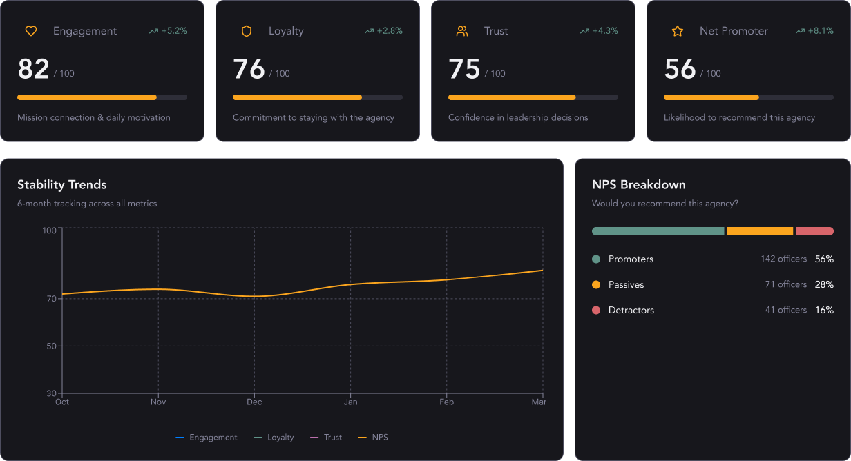 Aptitude provides data that signals staffing stability by tracking how connected employees are to the mission, how committed they are to staying, how much confidence they have in leadership, and whether they would recommend the agency as a place to work.